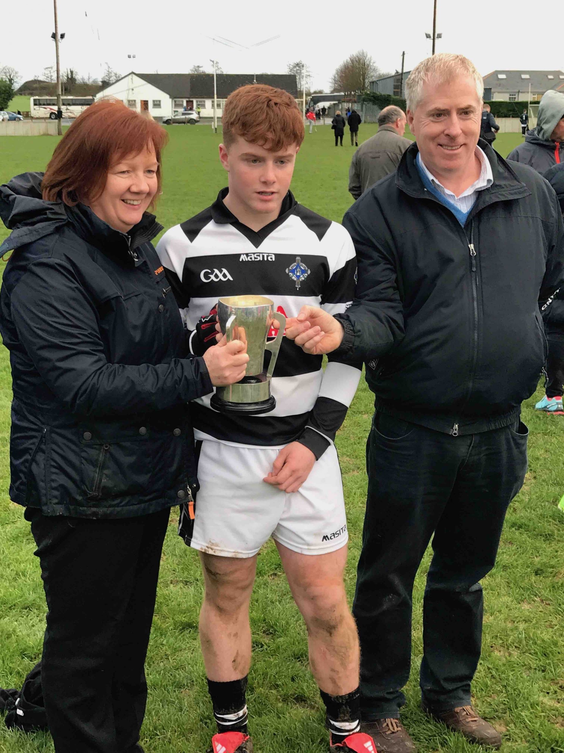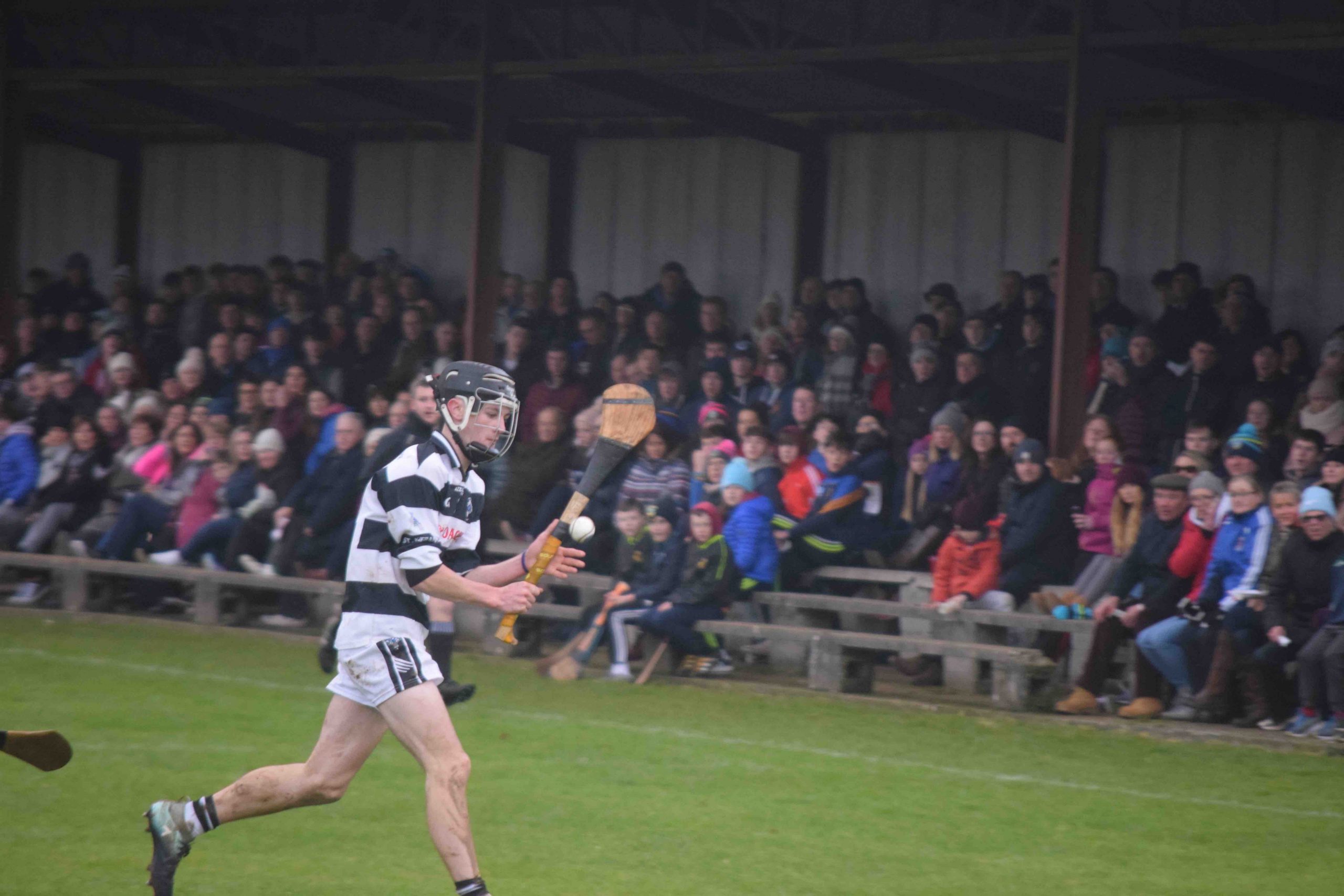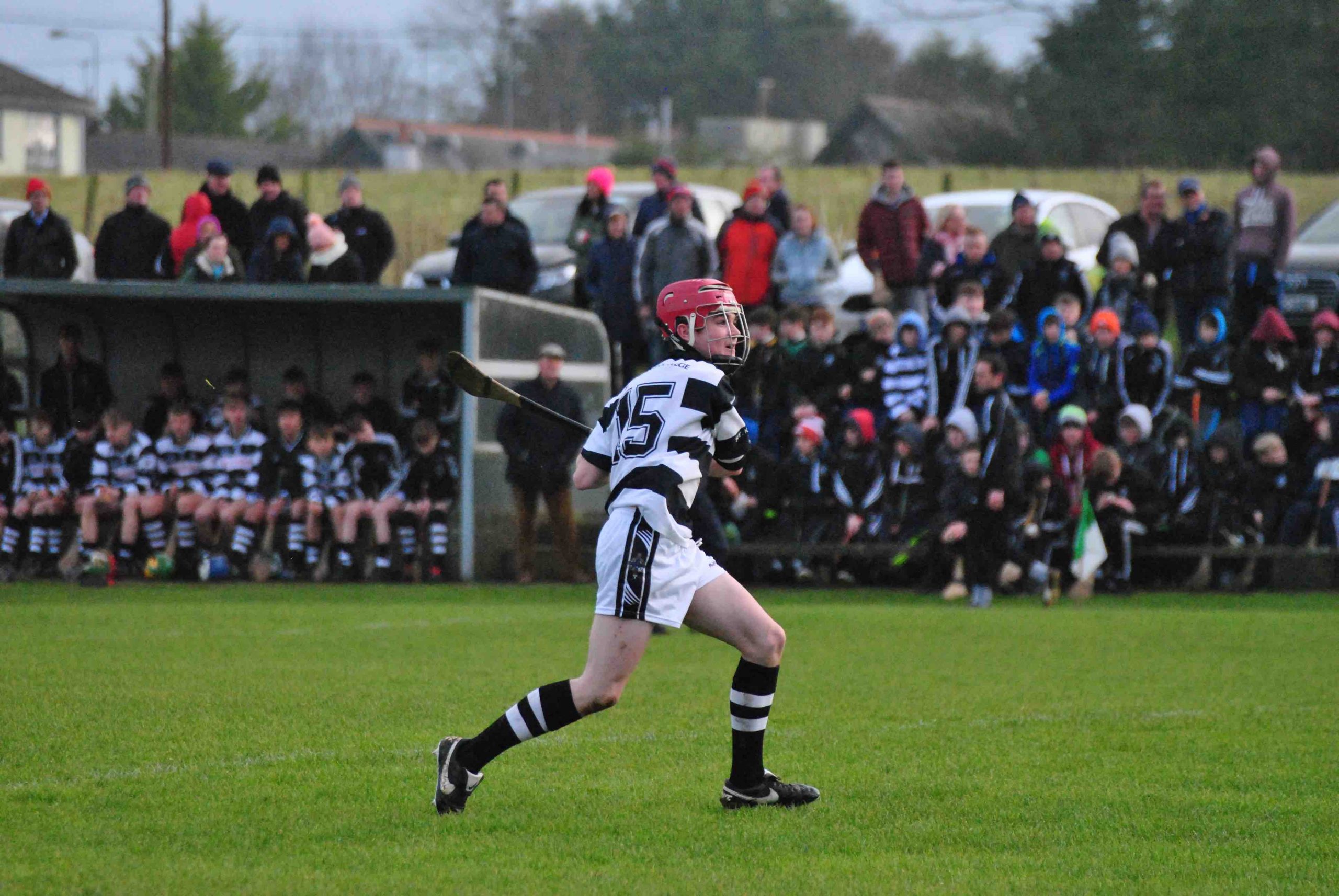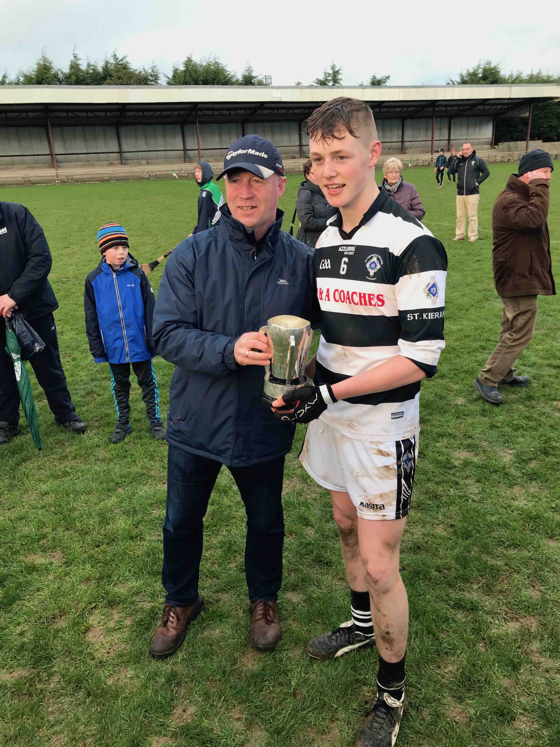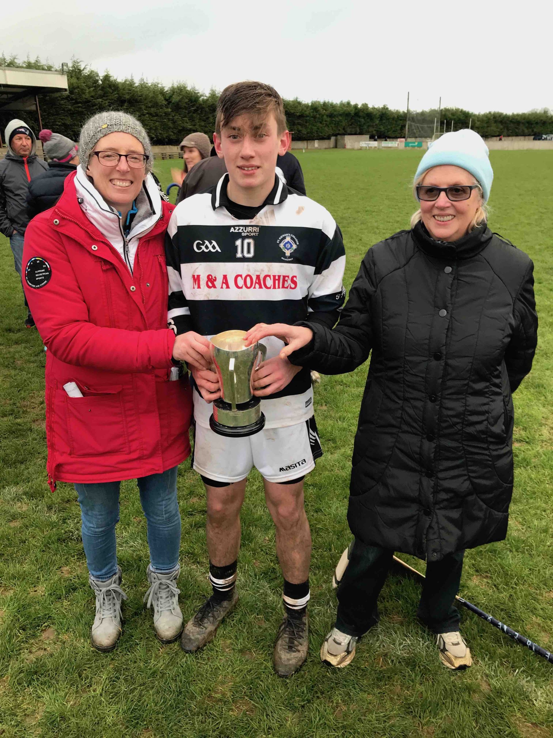 A never say die attitude from St Kieran’s saw the Niall McInerney Cup return to the College for a fourth time. The excitement and tension began from the throw in. As both teams settled, Thurles CBS opened the scoring through half forward Chris Munroe in the 4th minute. St Kieran’s replied with a green flag a minute later. Bustling full forward Peter Donohoe lifted a low delivery from Jack Doyle and powered past his man to finish to the net. Thurles responded well with a point from Stephen Ferncombe from a free.  For the next twelve minutes, St Kieran’s took control of the game with four points from Eoin Guilfolye, one from play, two frees and one from a 65 after good work from Jack Doyle and Darragh Maher. Maher dissected the posts again in the 20th minute after a strong solo run. Thurles’ short passing game was meeting a brick wall in the form of captain Harry Walsh, David Fogarty, Jim Ryan, Killian Rudkins and the tenacious Andy Hickey. Eventually, Thurles got back on the scoreboard through corner forward, Paddy Creedon in the 23rd minute and free taker, Stephen Ferncombe in the 26th. After a tense and tight first half, the score was St Kieran’s 1-5 Thurles CBS 0-4.