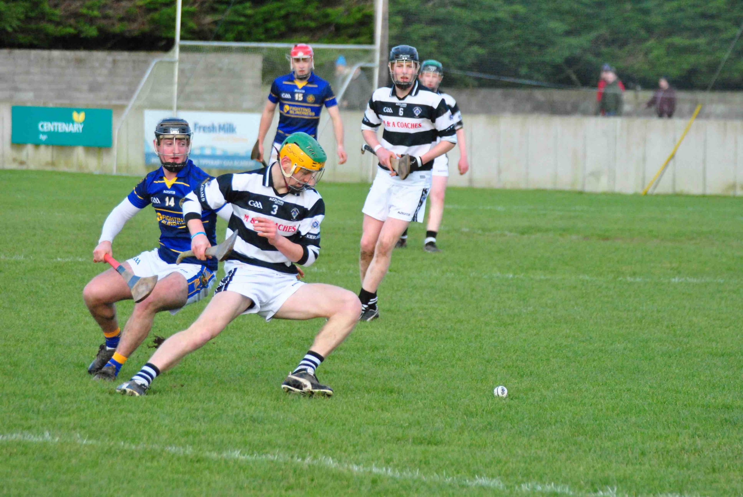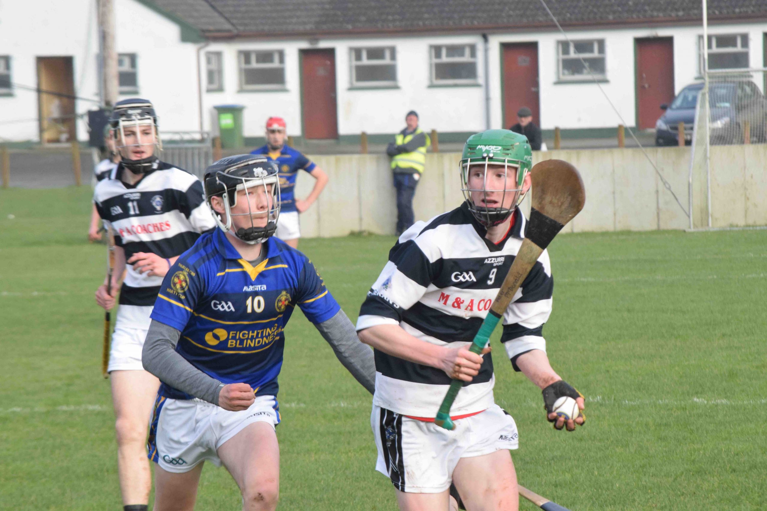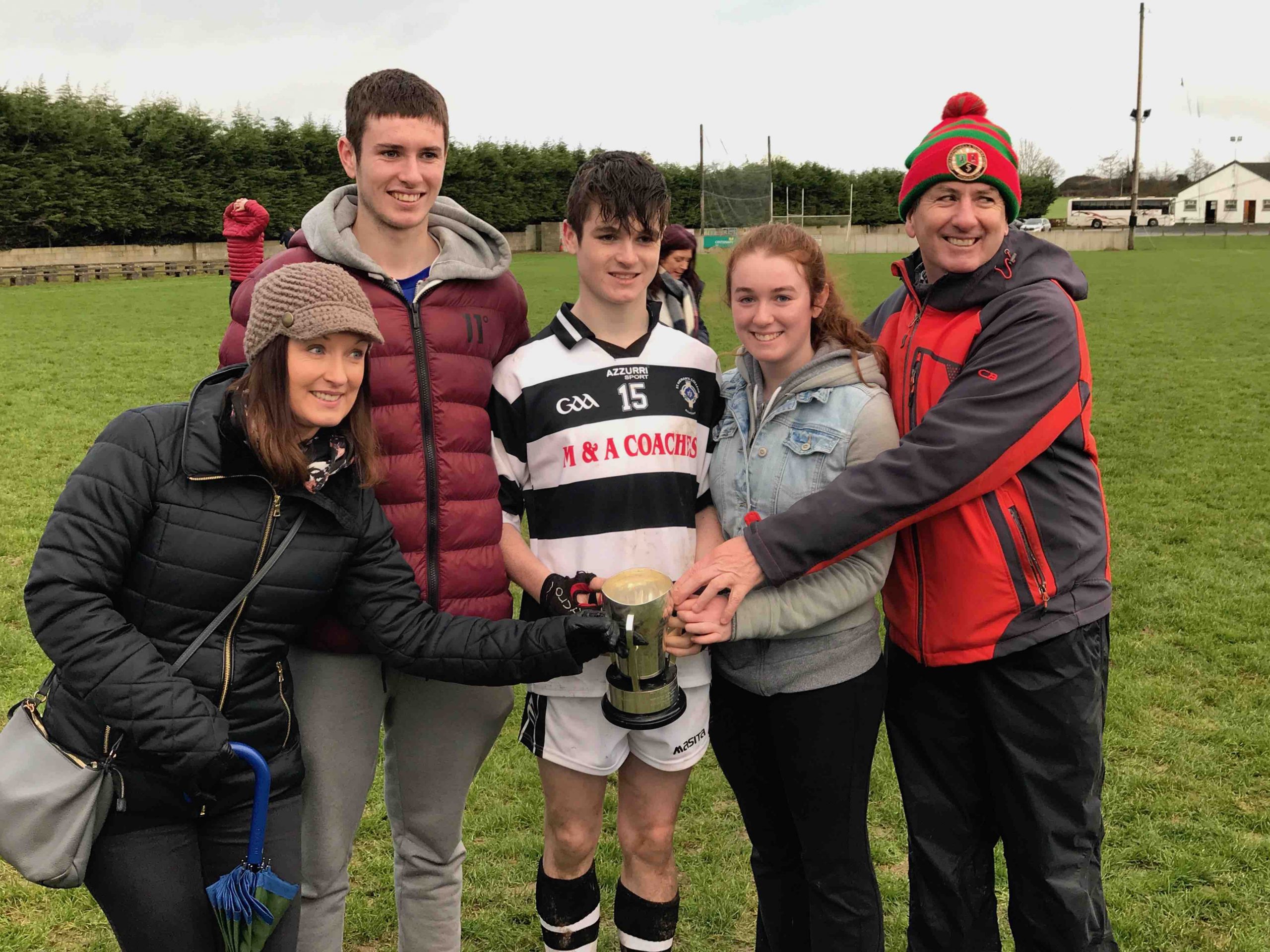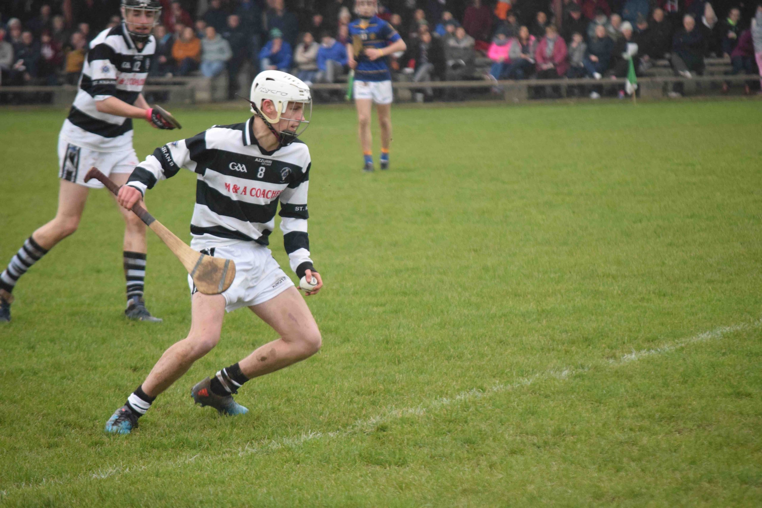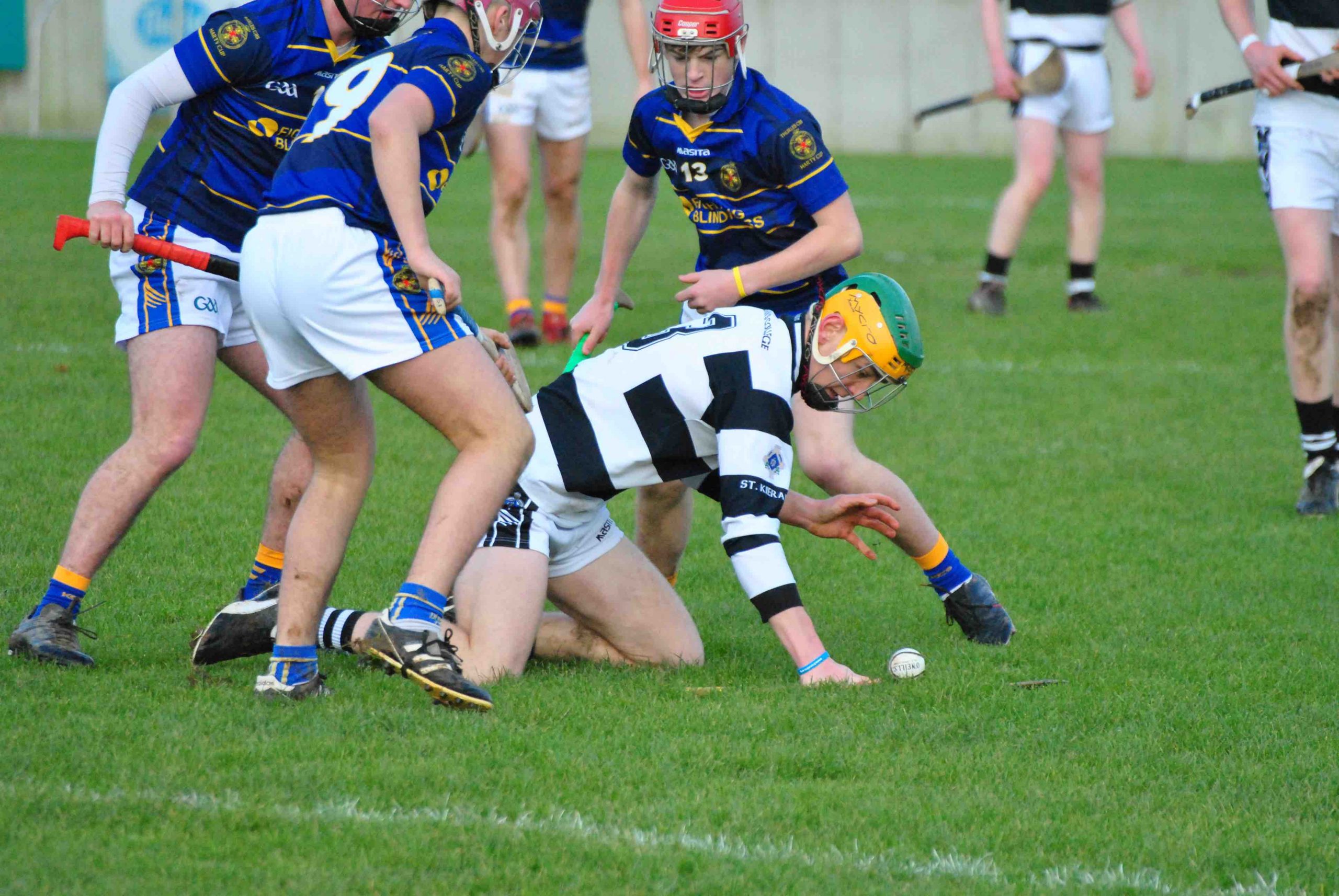 A never say die attitude from St Kieran’s saw the Niall McInerney Cup return to the College for a fourth time. The excitement and tension began from the throw in. As both teams settled, Thurles CBS opened the scoring through half forward Chris Munroe in the 4th minute. St Kieran’s replied with a green flag a minute later. Bustling full forward Peter Donohoe lifted a low delivery from Jack Doyle and powered past his man to finish to the net. Thurles responded well with a point from Stephen Ferncombe from a free.  For the next twelve minutes, St Kieran’s took control of the game with four points from Eoin Guilfolye, one from play, two frees and one from a 65 after good work from Jack Doyle and Darragh Maher. Maher dissected the posts again in the 20th minute after a strong solo run. Thurles’ short passing game was meeting a brick wall in the form of captain Harry Walsh, David Fogarty, Jim Ryan, Killian Rudkins and the tenacious Andy Hickey. Eventually, Thurles got back on the scoreboard through corner forward, Paddy Creedon in the 23rd minute and free taker, Stephen Ferncombe in the 26th. After a tense and tight first half, the score was St Kieran’s 1-5 Thurles CBS 0-4.